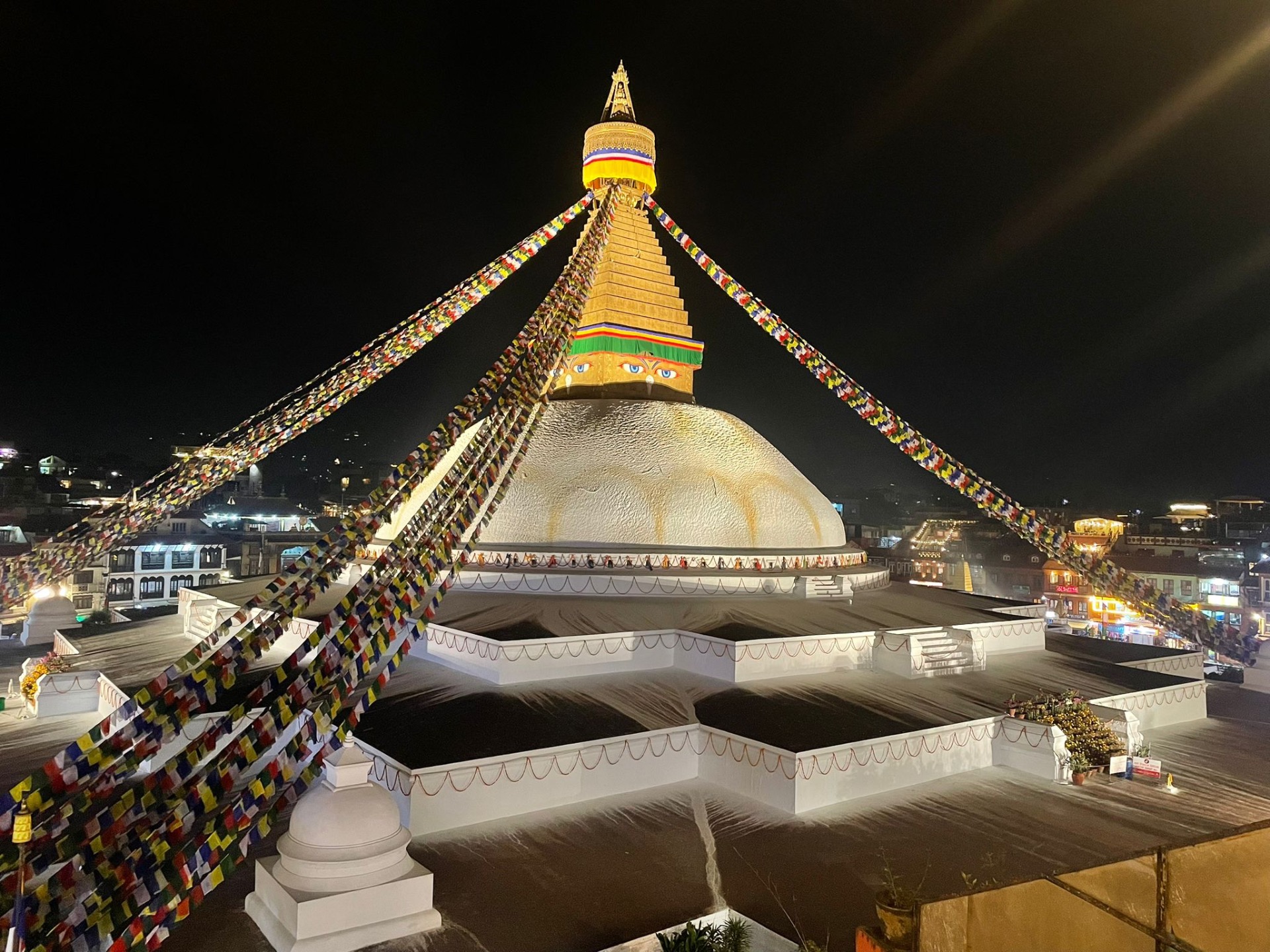 Connu comme le plus grand Stupa d'Asie. Il fut pendant longtemps le point d'arrivée des caravanes qui traversaient l'Himalaya. On venait y remercier le Bouddha lorsque le voyage s'était bien déroulé. Les yeux du Bouddha peints aux 4 points cardinaux posent un regard observateur sur les Hommes et leurs actions. Une foule de pèlerins népalais mais aussi tibétains, se retrouve dans ce centre bouddhiste construit en 600 par un roi Tibétain, pour accomplir la kora (circumambulation rituelle) et faire tourner les moulins à prières renfermant les paroles sacrées « Om Mane Padme Um ».