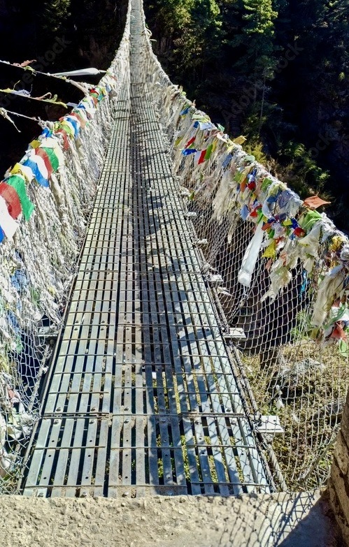 Sur le chemin qu'utilise les marcheurs pour arriver à Namche Bazaar, il faut traverser sur une passerelle les gorges étroites de la rivière Dudh Koshi. Cette passerelle est l'une des plus grande de ce genre.